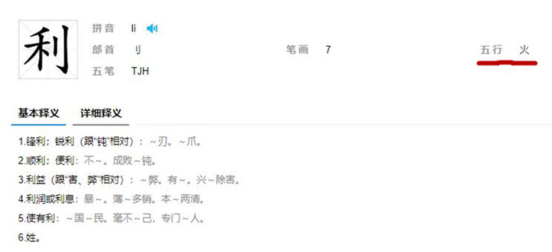 再找一个字:利,百度查到字的五行是火,还有其他的网站查出来五行属金。实际这个字的造字法是一根禾苗和一把镰刀,以刀起禾表示锋利。阳边【刂】五行属金,阴边【禾】为五谷,不看五行。如果说这个字的五行是属金的,那就太片面了,【禾】是这个字当中的一部分,不能当做不存在。所以有时会遇到一些鉴定姓名的朋友问我某个字的五行,我告诉他这个字不看五行,他可能会觉得我不愿意回答他,但是我说的是事实,只是他不明白。